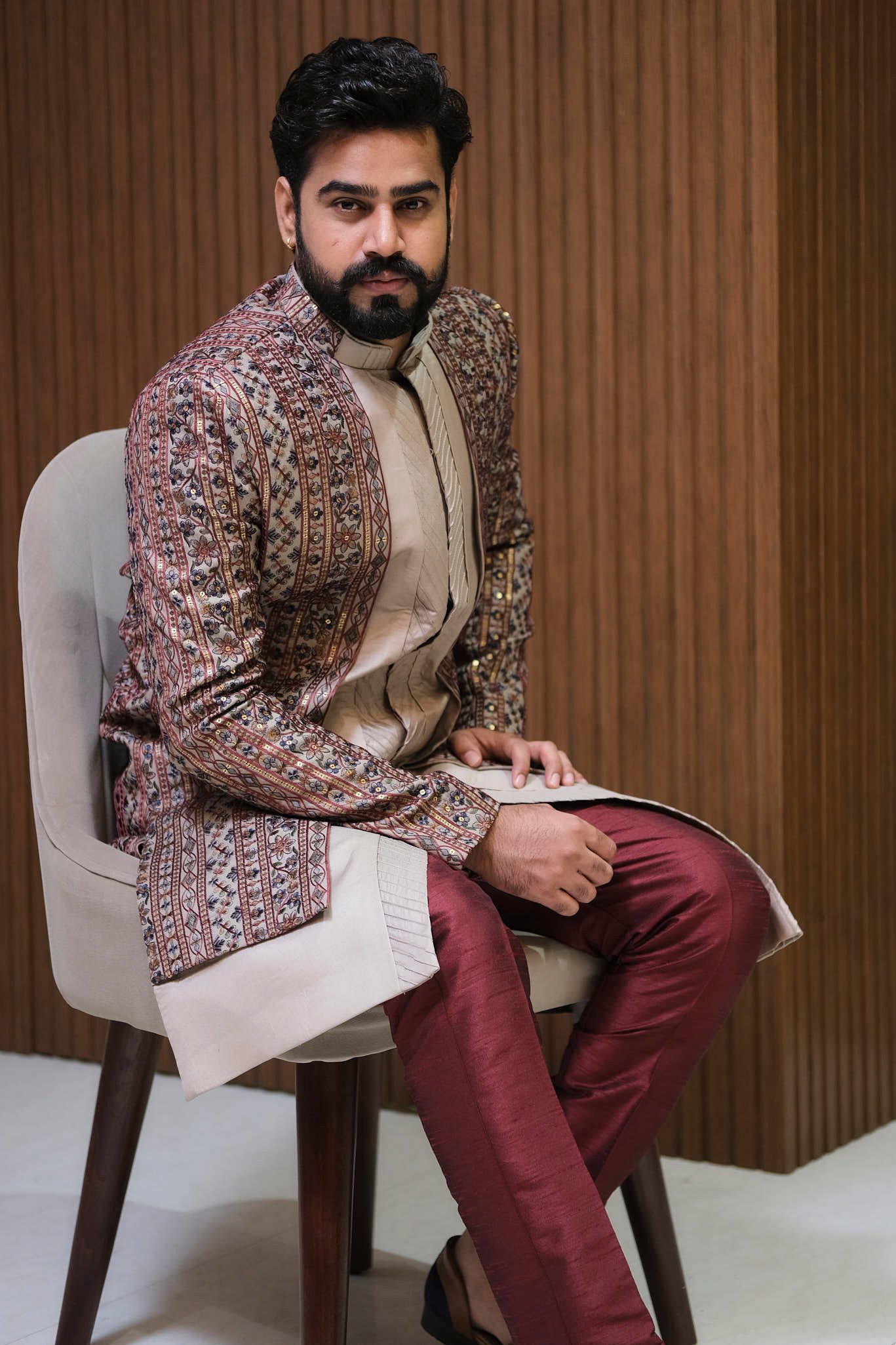 The cream and maroon Indo Western outfit by Ethnic Monarch is a stunning fusion of traditional embroidery and modern design. The cream base is accentuated with maroon details, creating an elegant and captivating ensemble for any special occasion.