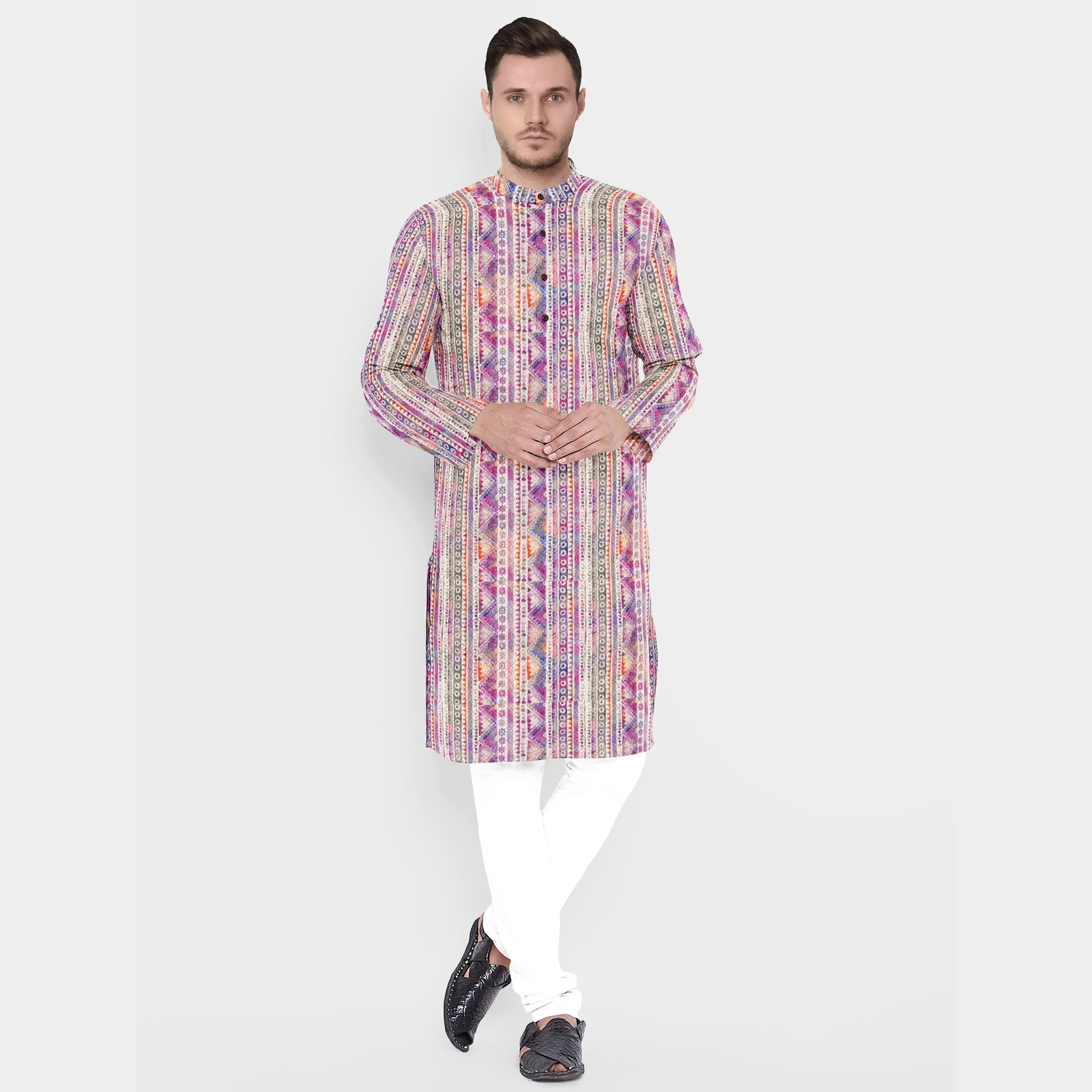 Multicolored Fancy Fabric kurta is very pretty and attractive and is paired with with White Cotton Payjama. Mojari and all other accessories are for photographic purpose only and not included in the product. Slight variation in colour and embroidery might be possible.